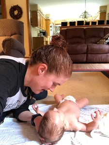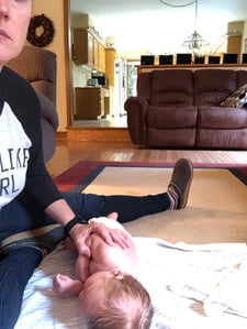 For rotation/head turning while they are on their stomach, I will either turn their head while they are in tummy time (and make sure that I am on the floor making eye contact with them), or I will have them lie on my chest (so much more fun for them and me) or use the carrier. I just make sure I focus on turning in the direction the PT has recommended or I make sure they spend equal time with their head in either direction.