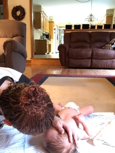 For rotation/head turning when they are on their back, I will get in the same position and gently try to turn their head so they are looking to one side. Again, if they resist, I follow the same steps as above. And, I am down at their level making eye contact and talking to them to distract them. Another trick for rotation is to start them on their side, and gently hold their head still (GENTLY) while you let their body roll back onto their back. You can see this in the pictures above. This way you are letting gravity do the work! Just remember, do not force the movements.