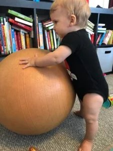 So what can you do? Find a soccer ball or playground ball, or even a balloon (although this won’t roll but it may go up in the air) and have it on the ground in front of them. Ideally they are standing independently at this point but you can also do it when they are standing and holding on at a support surface. Ask them to kick it to you. I always like to see what happens first. It could be nothing, it could be they pick it up, it could be they sit down, or they could attempt to kick it!